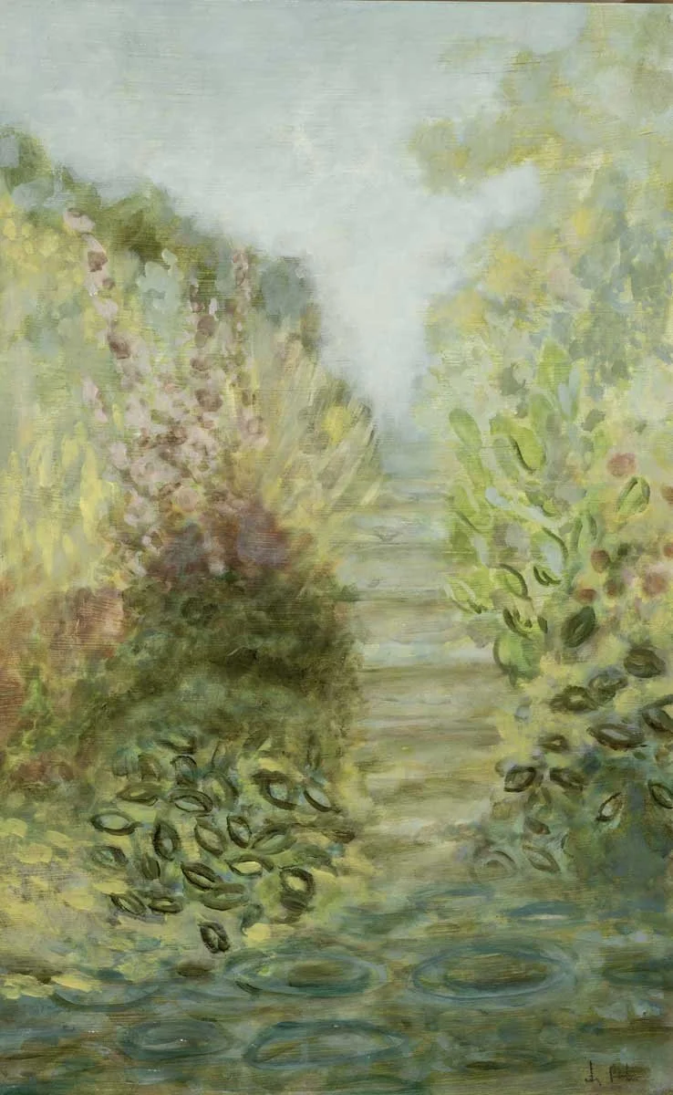 I have been living and painting in Santa Barbara for the past 40 years. Studies of the earth, sky and sea are prevalent in my most recent work. The organic shapes and patterns of these forms are diverse, intriguing, and beautiful to me. I am moved by their simplicity and their complexity. My airy, earthy and watery palette is inspired by these forms and is full of rich greens, blues, yellows, and browns. I paint with oil on wood panels so I can scratch and sand the surface as I paint a many-layered finish.